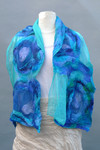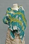 2009Zijde sjaal aan twee kanten gevilt. Aan een kant voornamelijk groen gevilt (zie foto) met gekrulde wol. En aan de andere kant voornamelijk paars gevilt met gekrulde wol. Op veel manieren te dragen.