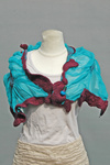 2010Deze sjaal heet een roze basis van zijde. Daarop zijn roze bloemen gevilt met daarachter lichtblauw tule en in elke bloem zit een kraal van echt turkoois.
