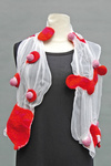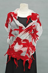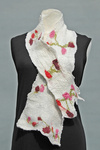 2008Roestrode sjaal, met groen en witte vol opgevilt. Tussen de wol zitten ook highlits van witte zijde.