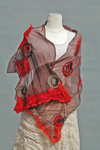 2009Donkerbruine zijde sjaal met rode en bruine tinten wol gevilt. Op enkele plekken is rood spaans kant verwerkt.